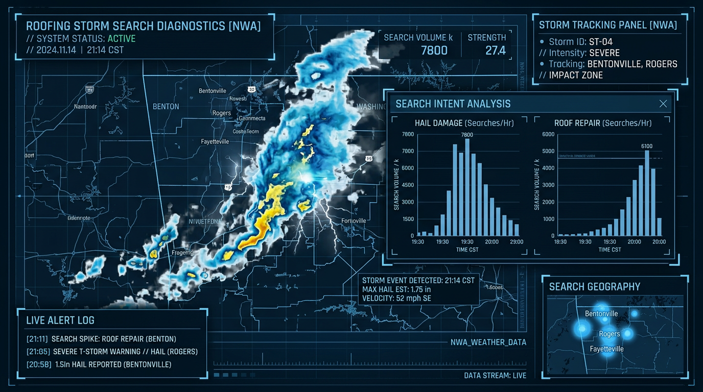 When a hail storm moves through Rogers or Bentonville, search volume for "roofing company near me" and "hail damage roof repair" can surge within hours. These aren't homeowners browsing for estimates or planning a project. They're standing in their driveway looking at damage and picking up the phone. 88% of consumers who search for a local service on mobile call or visit within 24 hours (Think With Google). For storm-related roofing searches, that window is even shorter.